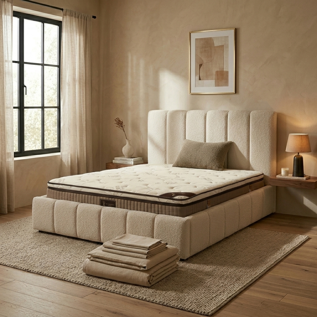 Lits design capitonnés, matelas premium — livrés chez vous.